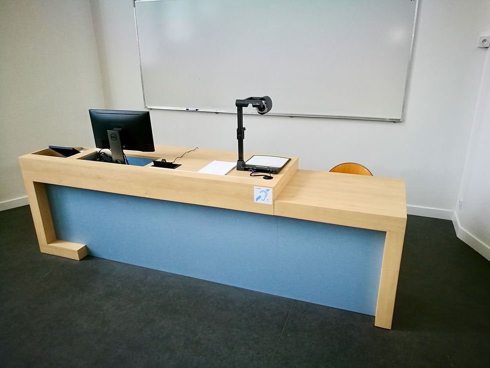 restauration des anciens pupitres d'amphithéatres (ossatures métalliques) avec intégration de nouveaux plateaux Hévéa lamellé collé massif