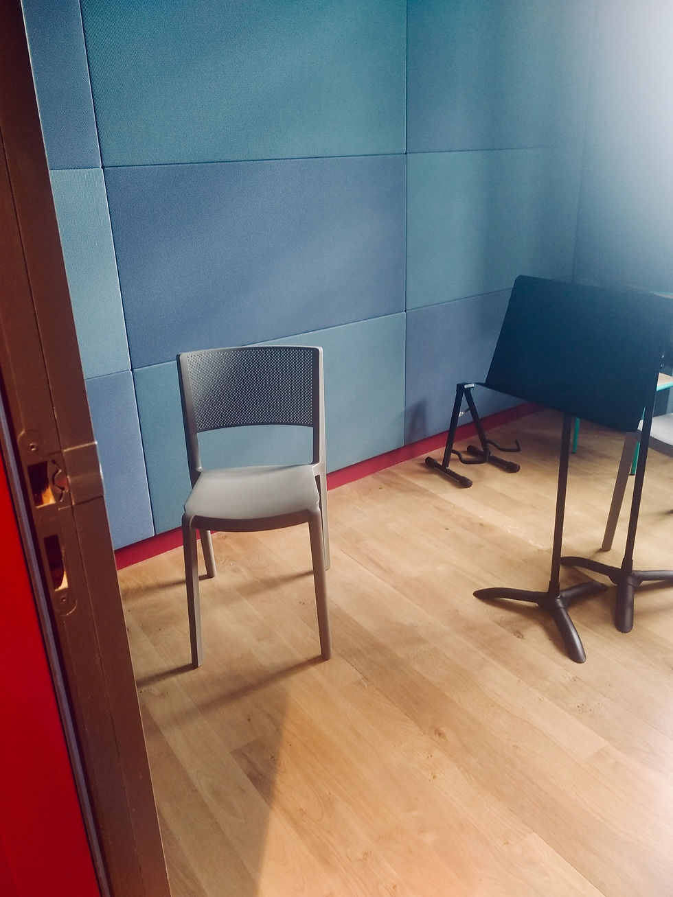 Caissons acoustiques en médium coloré fermés par des grilles en métal déployé dans les salles musique